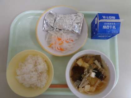 今日の献立は、ごはん、鯖の銀紙焼き、なます、すまし汁、牛乳 です。