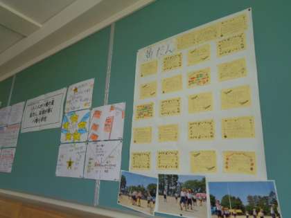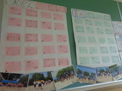 運動会を終え、子供たちが団の仲間に向けて書いたメッセージカードが校内に掲示され、校内放送でも紹介されています。一緒にがんばった仲間へのメッセージから、子供たちの達成感や満足感が伝わってきます。