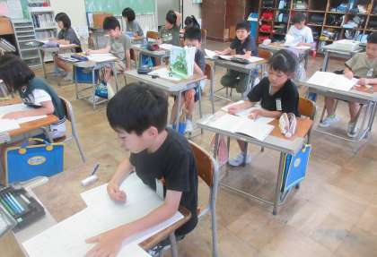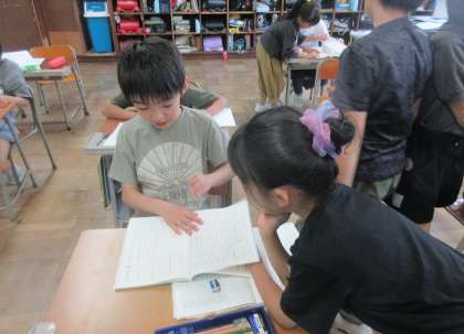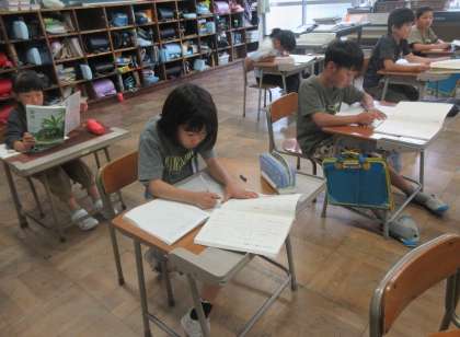 国語科では、漢字の音と訓について学習しています。見つけた漢字の音と訓を両方使った一文づくりをしました。