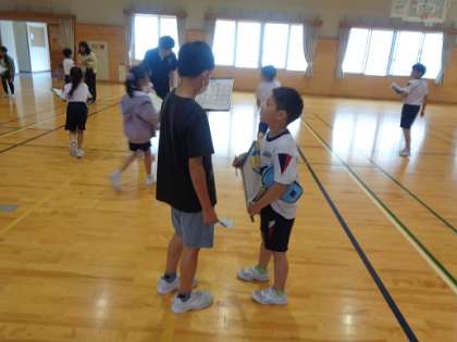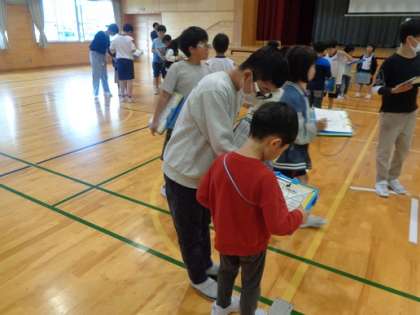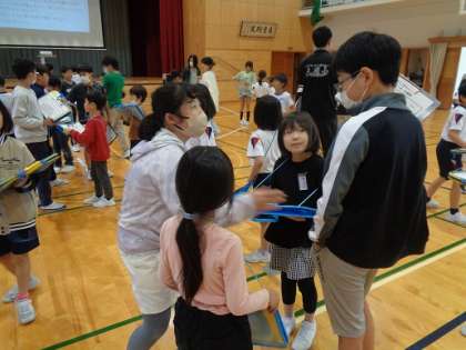 交流ゲーム「あいさつビンゴ」では、どの子も進んで他学年と関わり、体育館が温かい雰囲気に包まれていました。