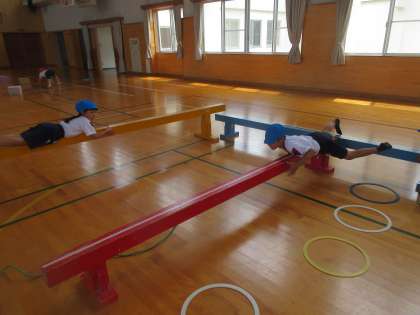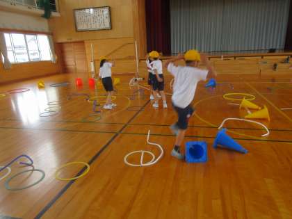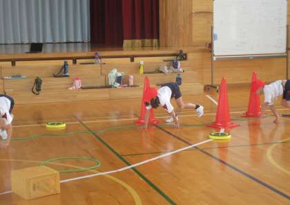 体育科では、動物アスレチックの続きを行いました。今回は、各団で使う道具を自由に決めました。平均台や長縄など様々な物を使っています。