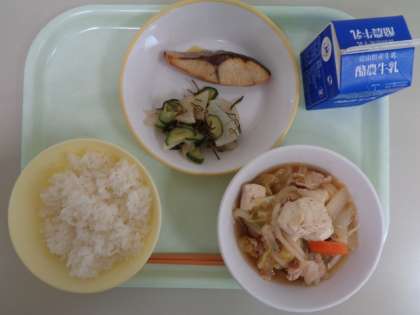 今日の献立は、ごはん、ふくらぎの西京焼き、昆布和え、肉豆腐、
