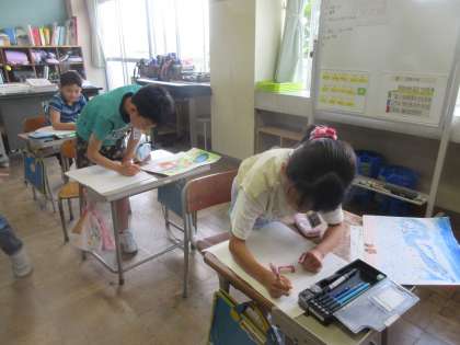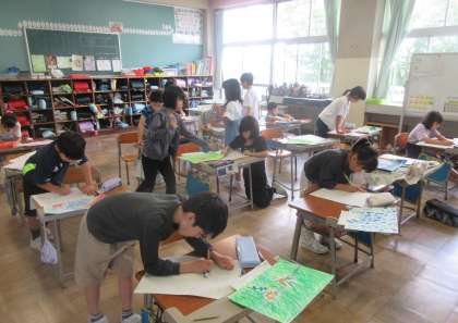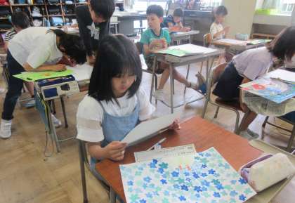 図画工作科「ことばから思いうかべて」の作品が出来上がったので、鑑賞会をしました。友達の「いいなあ」「上手だなあ」と思ったところを見つけて、カードに書き込みました。