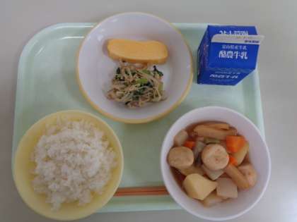 今日の献立は、ごはん、厚焼き卵、小松菜のごま和え、関東だき、