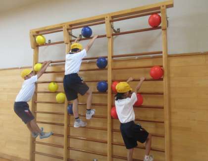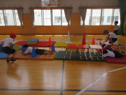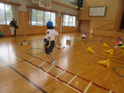 今日の体育は、最後の動物アスレチックでした。これまでは、たくさんの器具を置いていましたが、今回は洗練されている様子でした。コースがはっきりと分かったり、様々な表現ができるような器具の置き方をしたりしていました。