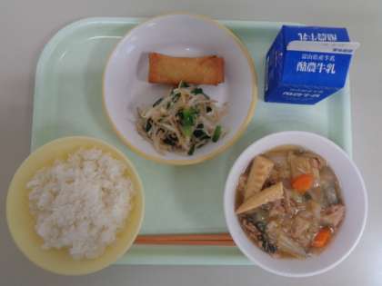 今日の献立は、ごはん、春巻き、塩ナムル、八宝菜、牛乳 です。
