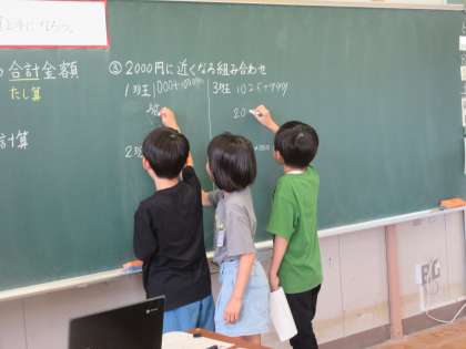 友達と「あといくらくらい」「これとこれでいくら」などを話し合いながらの学習をすることができました。
