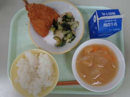 今日の献立は、ごはん、あじフライ、海藻サラダ、冬瓜のみそ汁、