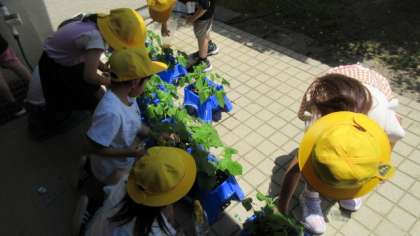 今日は、あさがおの観察日記を書きました。子供たちは毎日水やりをかかさずに行っています。前回の観察から約2週間。太陽の光をたくさん浴びたあさがおは、葉が大きくなり、ツルも伸びてきました。あさがおの成長に気付いた子供たちはとても嬉しそうでした。観察の後には支柱を立てました。これからの成長が楽しみです。