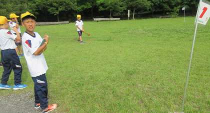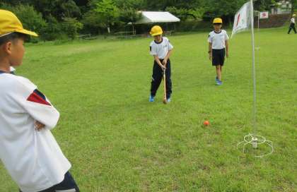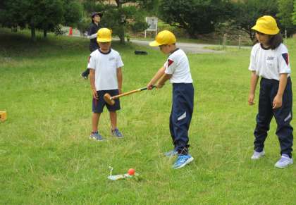 午後の二つ目の活動は。「グラウンドゴルフ」です。班の友達と協力して、少ない打数でゴールを目指します。