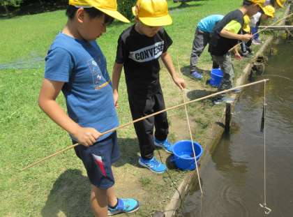 宿泊学習での最後の活動は、ザリガニつりをしました。