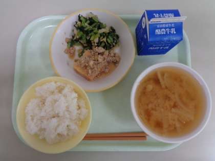 今日の献立は、ごはん、揚げ出し豆腐の肉みそかけ、磯あえ、みそ汁、