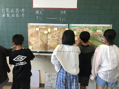 縄文時代と弥生時代のくらしの様子を見て、さまざまな発見や疑問を出しています。