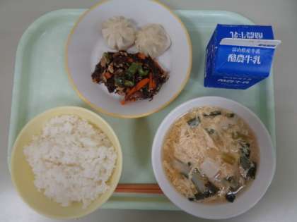 今日の献立は、ごはん、えび包子、もずくのチャプチェ、にら玉汁、