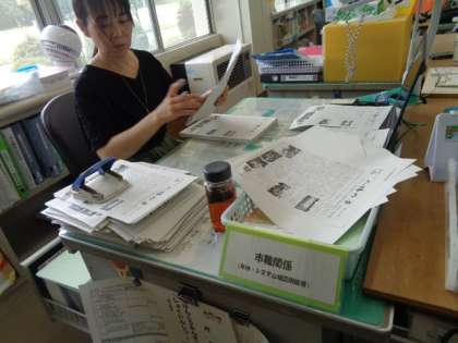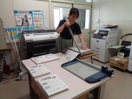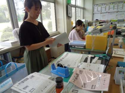 現在、7月号の配付に向けて準備をしています。保護者や地域の皆様にお届けするため印刷から始めますが、少しでも経費を削減するため、大きな用紙に印刷してから半分に裁断します。そのとき、印刷にずれがないかや白紙が混ざっていないかも見ています。次に、枚数を数えますが、再度、用紙が折れ曲がっていないか、印刷ミスがないかを確認していきます。最後に、学級や町内ごとの部数にまとめます。地域へ配付する分は、地区センターへ届けています。