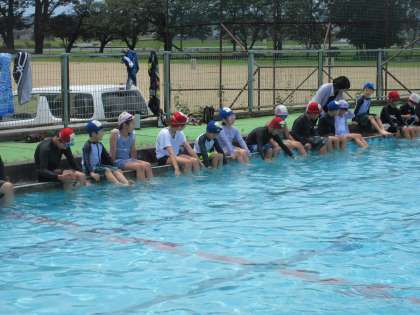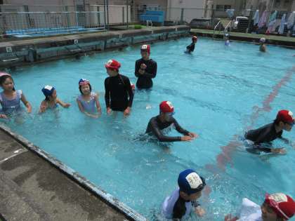 水が苦手な子も、なかよし班の6年生にたくさん声をかけてもらいながら、少しずつ水に慣れていきました。プールからあがると、「楽しかった」「今年は、泳げるようになりたいな」「次はいつ入るの」と、次の水泳学習を楽しみにしている様子でした。
