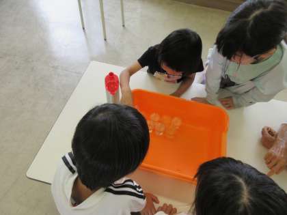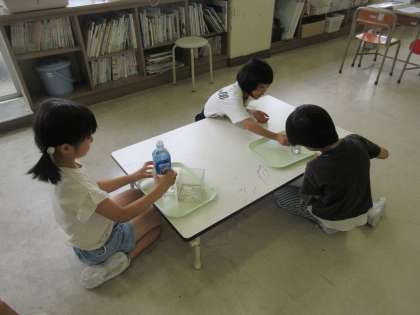 算数科では、「水のかさ」の学習に入りました。1dLの容器を使って水筒やペットボトルの水のかさを調べました。また、1L=10dLを確かめる学習では、どうやって調べるかを子供たちが考えた後、実際にやってみました。1dLの容器10ぱいで1Lの容器が満タンになったとき、「本当だ!」「すごい」と、ぴったりになった嬉しさや、確かめることができた喜びを感じている様子でした。