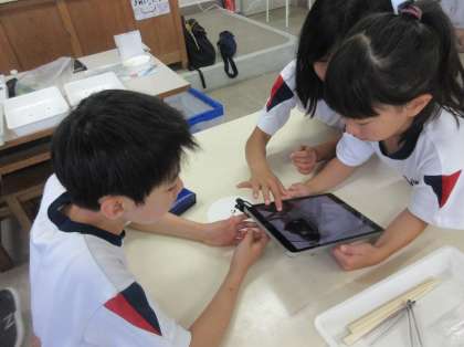 タブレットに拡大鏡を取り付けて、ありを観察しました。