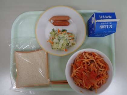 今日の、スパゲッティの中には、トマトがたくさん入っています。トマトの旬は夏。今からが一番おいしくて栄養たっぷりの時期になります。新鮮なおいしさを味わうためにサラダで生のまま食べたり、トマトの味を生かしてスープやシチューのような煮込み料理、ソース等に使ったりします。
