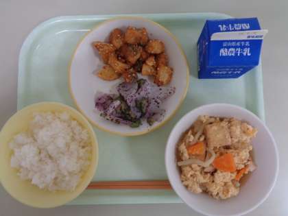 今日の献立は、ごはん、魚とじゃがいものごまからめ、ゆかり和え、