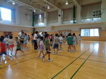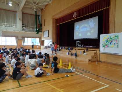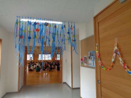 なかよしタイムに6年生が七夕集会を開きました。飾り付けられた体育館で、全校みんなでゲームをしたり合唱をしたりして、楽しいひとときを過ごしました。