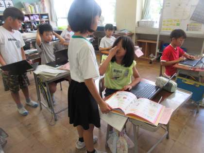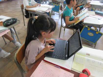 国語科では、「仕事のくふう、見つけたよ」の学習を進めています。毎回、各自のペースで進めています。分からないことがあれば、自分で頭をひねって考えたり、ミッションが進んでいる子に聞いたりするなど、それぞれの学習の仕方で進めていきます。