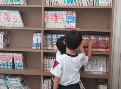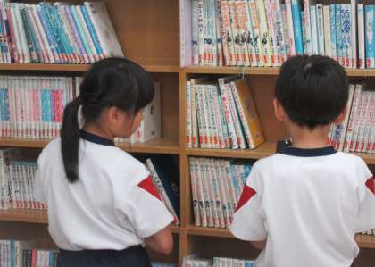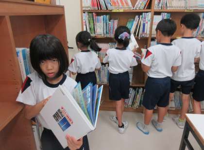 国語科では、図書室の本を利用した学習をしています。本で初めて知ったことや驚いたこどなどをクイズにします。クイズ作りに必要な本を借りることにしました。