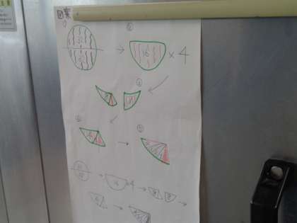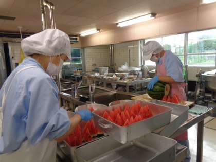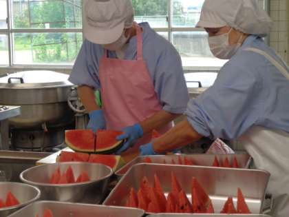 今日の給食には、八幡っ子の大好きなスイカが出ました。給食室では、調理員さんが、「どのスイカも同じ大きさになるように」「きれいな形で配膳されるように」と、事前にスイカの図を描いて、計算をしっかりして、それから切り始めます。心を込めて、協力し合って、切られたスイカを並べていきます。
