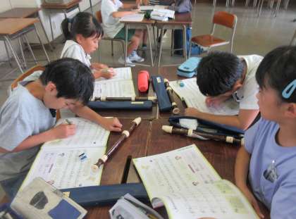 音楽科では、リコーダーの練習をしています。毎回、「しっぱれー!」「ソロサンマ」などの曲を使ってウォーミングアップをしています。