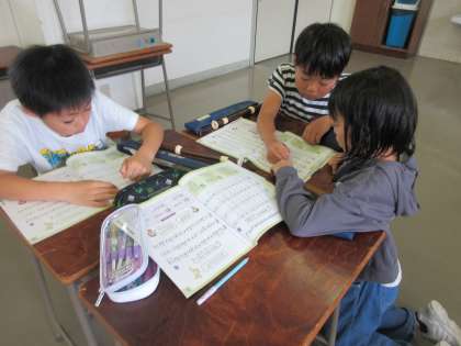 今回は、友達と話し合いながら音符を読んで、何の音か考え、リコーダー演奏をしました。