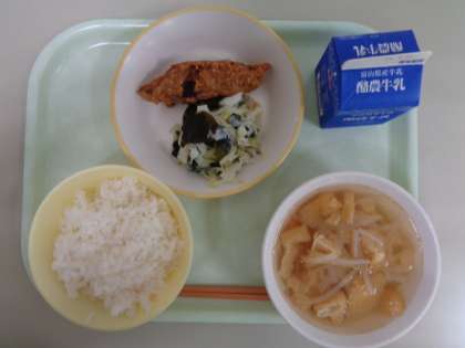 今日の献立は、ごはん、魚の利休揚げ、酢の物、みそ汁、牛乳 です。