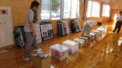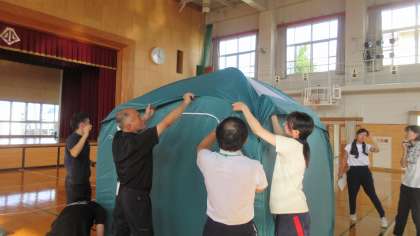 地区センター職員の方と避難所開設訓練を行いました。今回は、地域の方お一人も参加してくださいました。元日の地震発生時のことも振り返りながら、非常時に備えて備蓄物資を確かめたりパーテーションを設置したりしました。