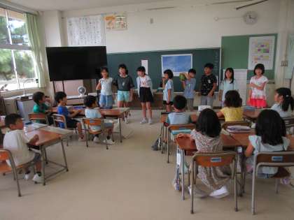 昨日、3つのスイカを収穫したので、残り二つは、子供たちみんなで相談をして1年生と職員室に持っていきました。