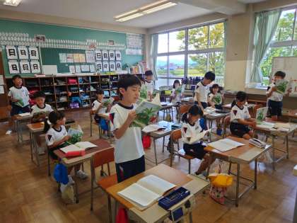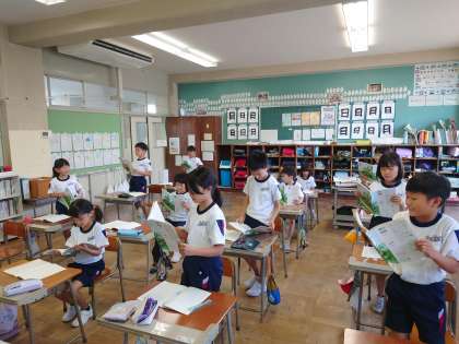 国語科では、詩を使った学習をしています。音読をして感じたことを伝え合います。音読の際には、男女で交代したり、自分が読みたい行がきたら立って読む「たけのこ読み」などをしたりしました。たけのこ読みから群読の楽しさを感じているようでした。