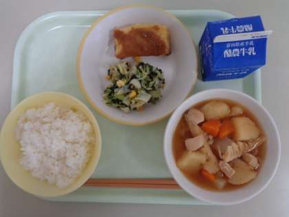 揚げ出し豆腐は、豆腐にでんぷんをまぶして揚げた料理のことで、だし汁やしょうゆを使ったつゆをかけて食べることが多いです。今日は、ごまを使ったタレがかかっています。ごまには、骨をつくるマグネシウムとカルシウムが多く含まれています。おいしく食べて、強い体をつくりましょう。