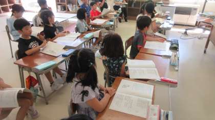 今年の学習発表会は、1・2年生合同で行います。今日は、本番に向けてみんなで歌を聴いたり、お話を読んだりしながら、自分がどの場面で頑張りたいか等、役について考えました。