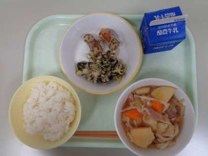 今日の献立は、ごはん、ちくわの南部揚げ、磯和え、