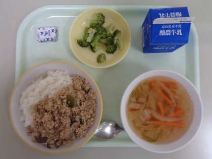 今日の献立は、ガパオライス、茹でブロッコリー、コーンスープ、