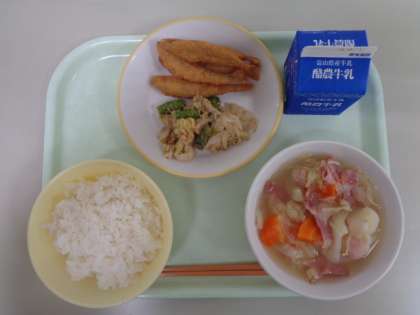 グリーンアスパラのごまだれ、野菜のスープ煮、牛乳 です。