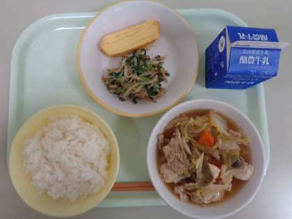 今日の献立は、ごはん、厚焼き卵、香味和え、肉豆腐、牛乳 です。