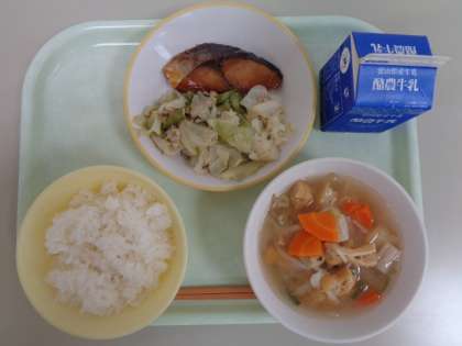 今日の献立は、ごはん、ふくらぎの照り焼き、野菜のピリ辛炒め、
