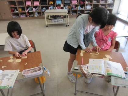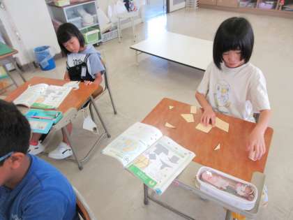 算数科では、「三角や四角の形をしらべよう」という学習入っています。導入では、巻末のパーツを使って、様々な形を作る活動を行いました。