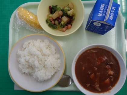 今日の献立は、ご飯、たべキリンハヤシ、ビーンズサラダ、バナナ、牛乳 です。
