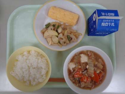 今日の献立は、ごはん、卵ロール、れんこんとまこもたけのきんぴら、