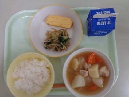 今日の献立は、ごはん、厚焼き卵、チンゲンサイソテー、ポトフ、