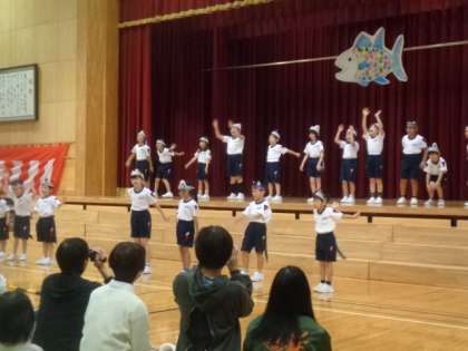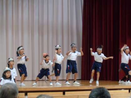 本番前には、「みんながこれまで一生懸命がんばって練習してきたことは、先生たちや仲間のみんなが知っています。失敗しても、だれも責めないから、安心して堂々と発表しようね」と声をかけました。そして、「みんなのにこにこの笑顔で、みている人たちをにこにこにしよう」という目標に向かって、子供たち一人一人は精一杯演技をしていたと思います。