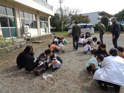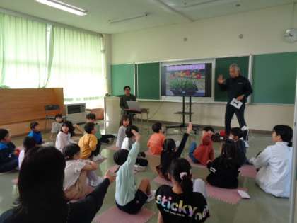 アール・タチバナ花プロジェクトとして、1・2年生がチューリップについての話を聞き、実際にチューリップの球根を植え付けました。いただいたプランターは、リサイクルでつくられたものです。SDGsの学習にもなっています。