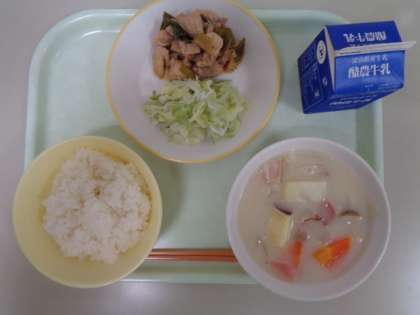 今日は「秋の香りシチュー」です。シチューの中をよく見ると、いつものシチューとは違った材料が使われています。それは、「さつまいも」と「しめじ」です。今日から11月、おいしい旬のシチューです。