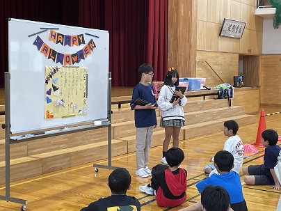 飾りや遊びにハロウィン要素満載の集会を6年生が企画し、5年生を招待しました。