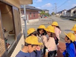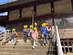 八町のお宮さんまで秋みつけに出かけました。道中、「先生!ここにはお地蔵様がいるんだよ」と話してくれた子供たち。お地蔵様に手を合わせていました。お花を見つけたり、道端のくっつき虫に興味をもったり、秋を感じて楽しみながらお宮さんに向かいました。到着後、神社でお参りもしました。